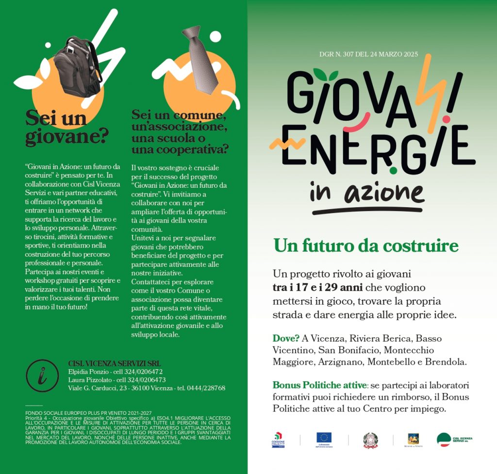 Capofila dell’iniziativa è Cisl Vicenza Servizi SRL, con l’obiettivo di accompagnare giovani tra i 17 anni (in possesso di qualifica professionale) e i 29 anni – disoccupati, studenti universitari, studenti del quinto anno di scuola superiore o impegnati nel Servizio Civile – in percorsi personalizzati di orientamento, formazione e inserimento lavorativo.