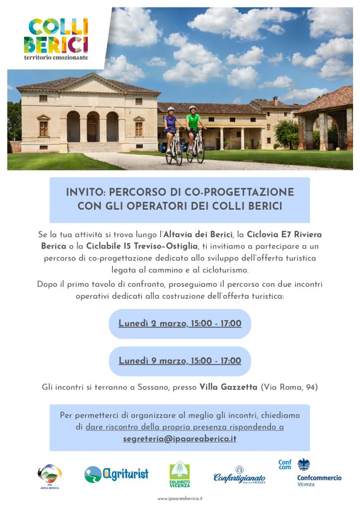 Se la tua attività si trova lungo l’Altavia dei Berici, la Ciclovia E7 Riviera Berica o la Ciclabile I5 Treviso Ostiglia, ti invitiamo a partecipare a un percorso di co-progettazione dedicato allo sviluppo dell’