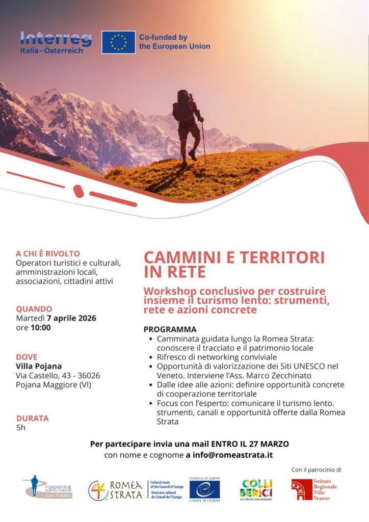 Il Comune di Pojana Maggiore, in qualità di comune capofila di un gruppo di Comuni attraversati dal tratto Romea Vicetia del progetto ROMEA STRATA, antica via di pellegrinaggio dal Mar Baltico a Roma, e in collaborazione con la Fondazione Homo Viator e l’Associazione IPA Area Berica, intende organizzare un workshop conclusivo rivolto ad operatori del settore turismo pubblici/privati.